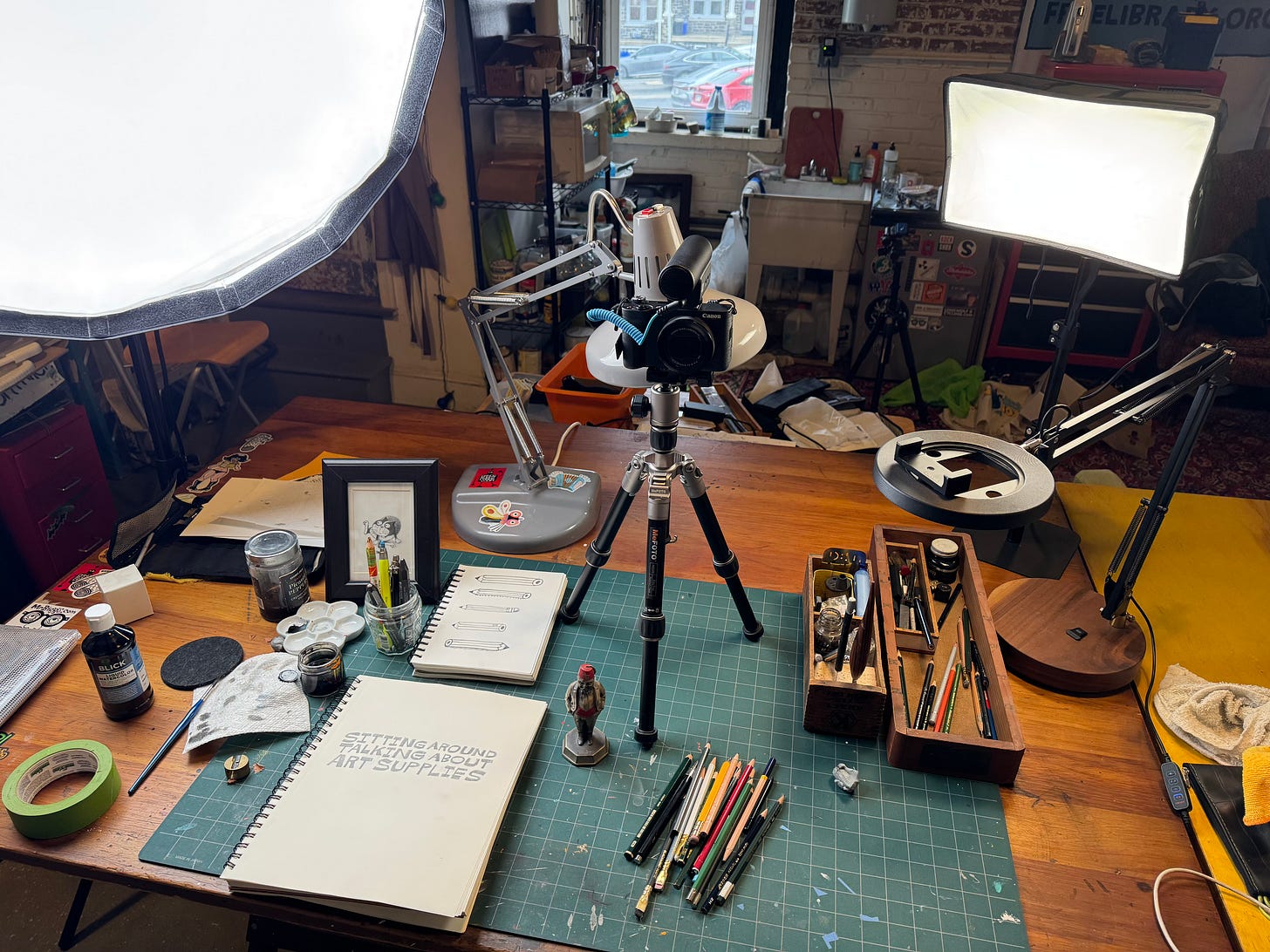 Check out this photo of my drawing table with new and borrowed lights, the camera with the microphone... Brave new world.