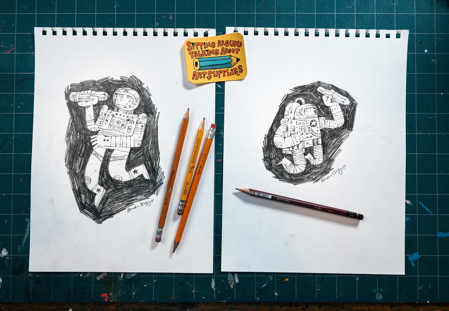 After a few weeks of living lavishly in the luxury of expensive art supplies, like a $2.60 pencil and several $25 lead-holders, I went the other way this week and spent an hour drawing an astronaut with some cheap-ass pencils I found on the sidewalk. Really.